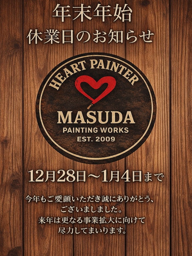 いつもハートペインターマスダのブログをご覧いただき、ありがとうございます。誠に勝手ではございますが、12月28日(日)~1月4日(日)の期間、年末年始のお休みをいただきます。皆様にはご不便をおかけいたしますが、ご理解のほど、よろしくお願いいたします。2026年もハートペインターマスダスタッフ一同、地域のお客様にご満足いただける外壁塗装・屋根塗装工事を行ってまいります✨今後とも足立区梅田の外壁塗装・屋根塗装専門店ハートペインターマスダを宜しくお願い申し上げます。