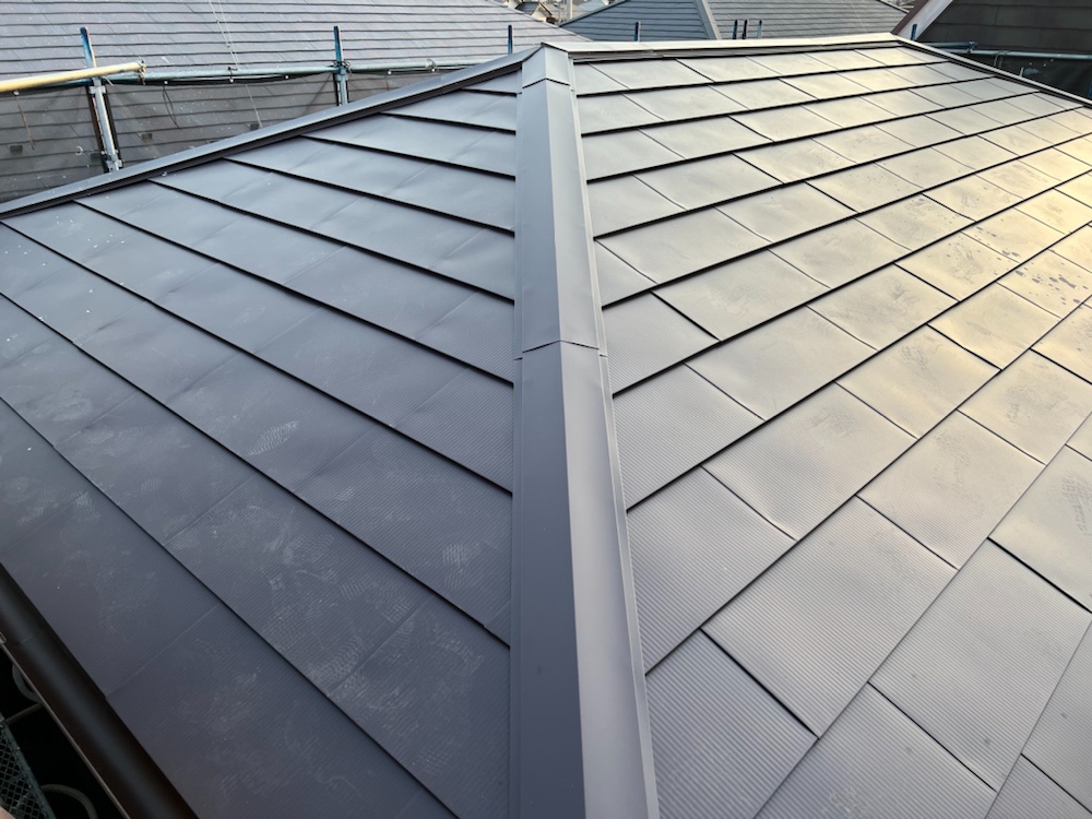 E様邸の屋根は新しいガルバリウム鋼板で覆われ、見た目の印象も変わり、耐久性も向上しました。お客様からは、「見た目も明るくなり、これで安心して過ごせます」との喜びの声をいただきました。