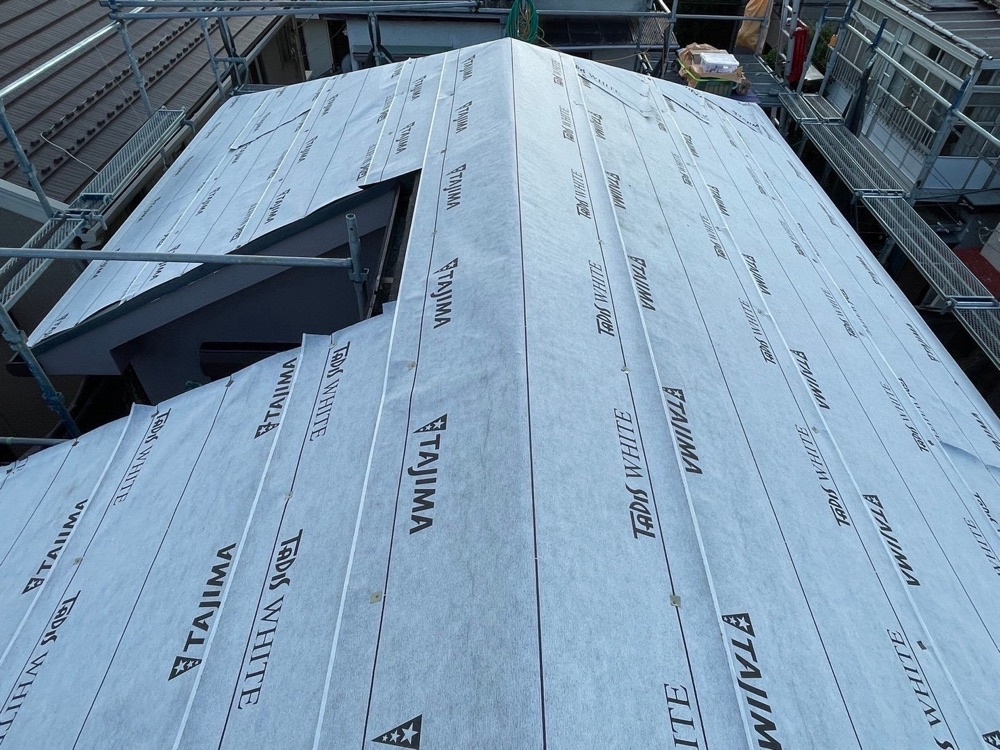 3. 防水シート(ルーフィング)の施工 既存の屋根の上に敷設します。